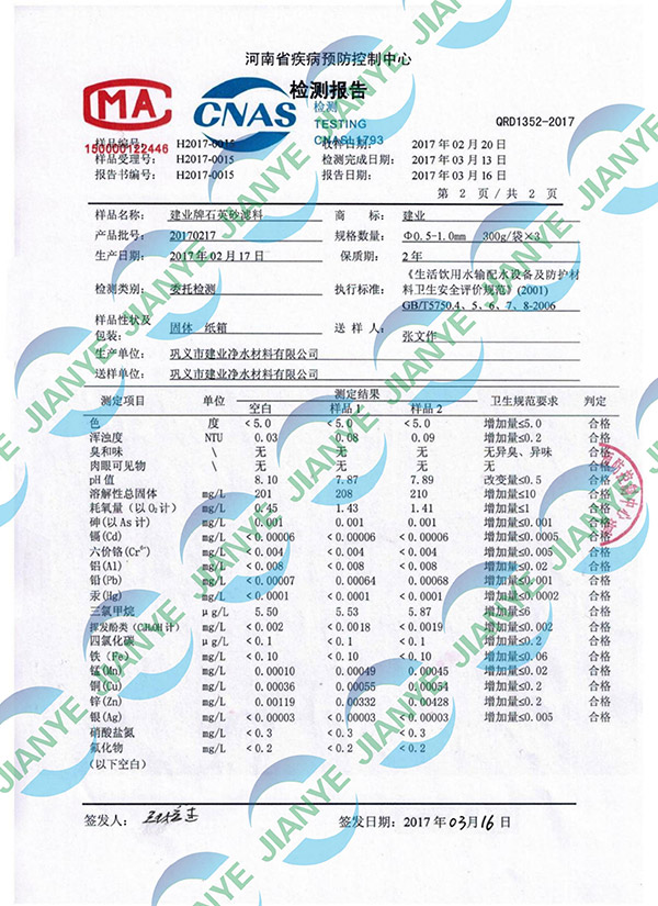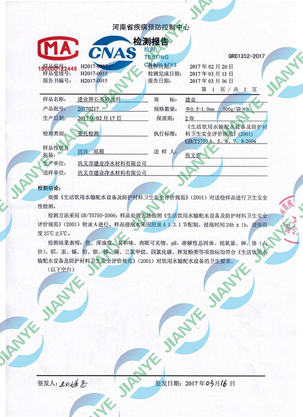 石英砂防疫站檢測(cè)報(bào)告【建業(yè)凈水】